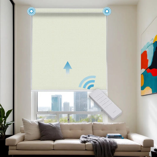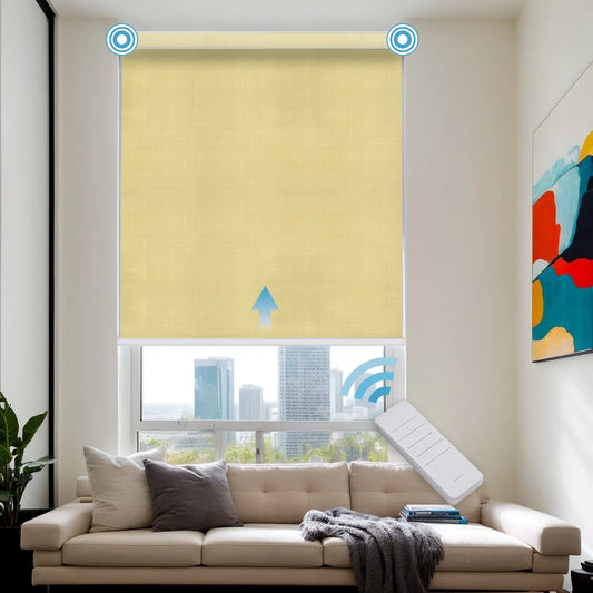 A124 Motorized Multicolor Linen Blend Blackout Roller Shades with Valance