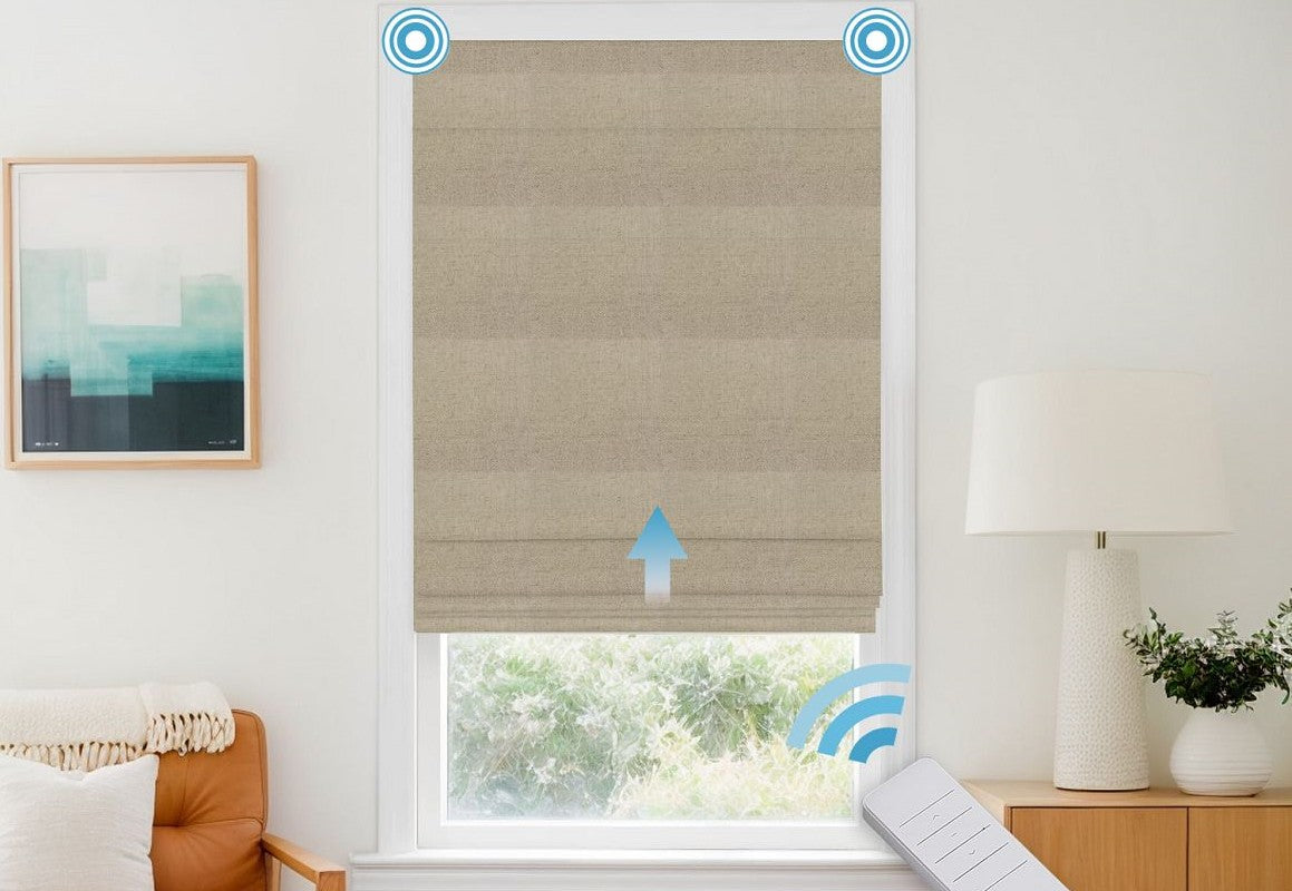 Experience effortless elegance with the Motorized Linen Light Filtering Roman Shades, crafted from a premium blend of 10% natural linen and 90% durable polyester. The linen fibers provide a breathable, organic texture, while polyester adds strength, wrinkle resistance, and easy maintenance. These motorized Roman shades offer smooth, convenient operation at the touch of a button, effortlessly raising or lowering the fabric. The light-filtering material softly diffuses sunlight, creating a warm and inviting ambiance while maintaining privacy. Ideal for bedrooms, living rooms, or dining areas, they combine modern convenience with natural sophistication.