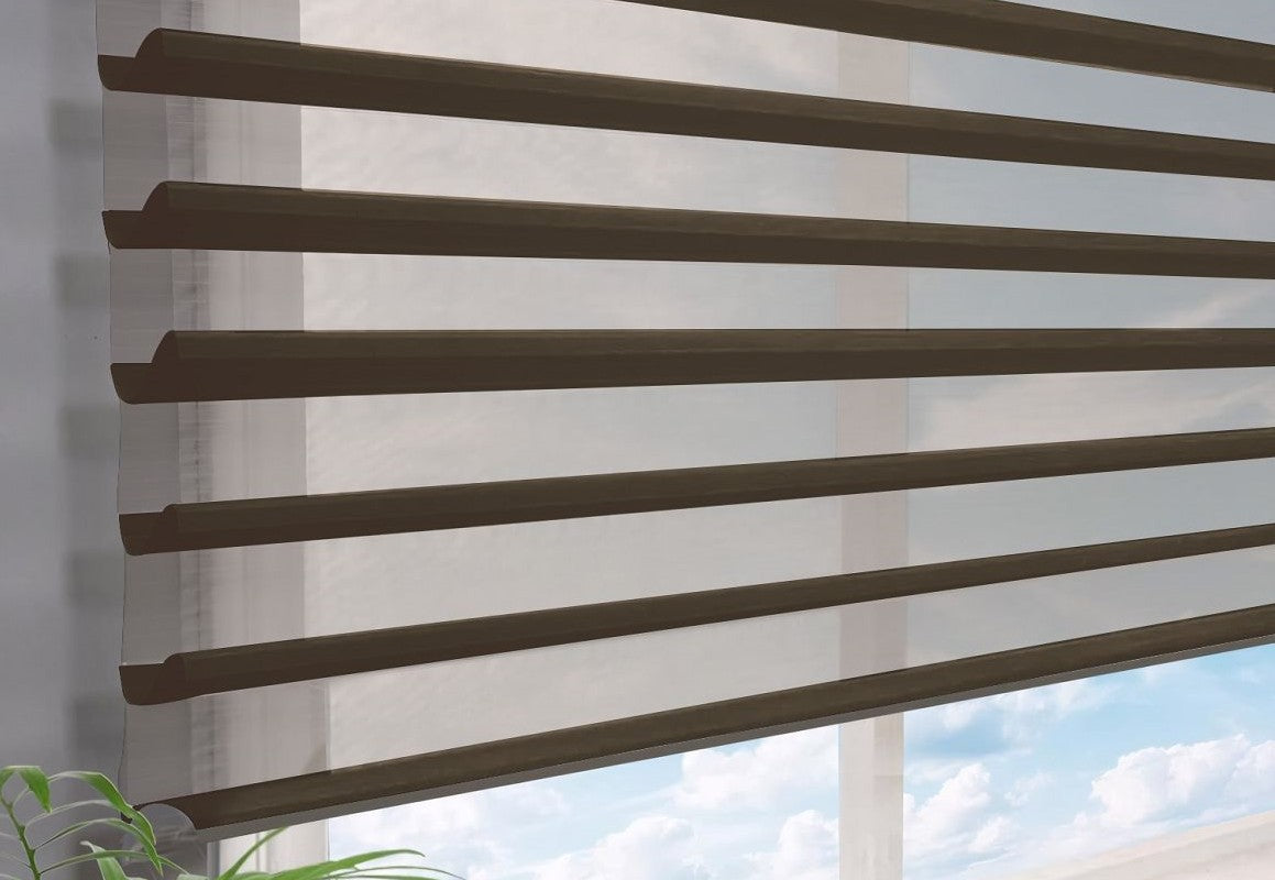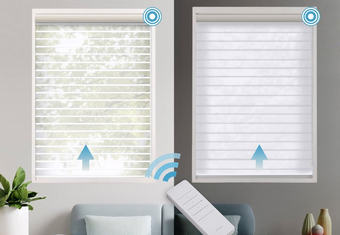 Experience ultimate light control and privacy with our Motorized Blackout Shangri-La Blinds. These blinds feature elegant fabric vanes suspended between two blackout sheer layers, offering a luxurious blend of style and functionality. With motorized operation, you can easily adjust the vanes or raise the blinds with a remote, perfect for bedrooms, nurseries, and home theaters.
