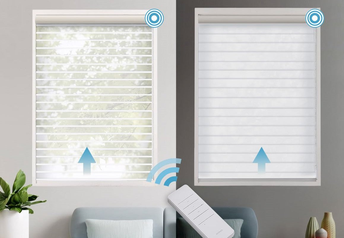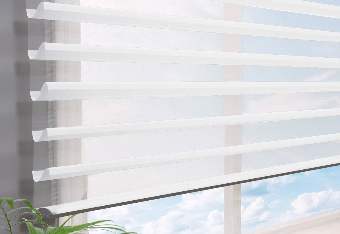 Achieve total light control with our Motorized Blackout Shangri-La Blinds, combining modern design with advanced blackout technology. Featuring suspended horizontal vanes between two layers of fabric, these blinds block out sunlight while adding depth and luxury to your interiors. With motorized control, you can easily adjust your blinds for privacy and ambiance—ideal for bedrooms, media rooms, or any space requiring darkness on demand.