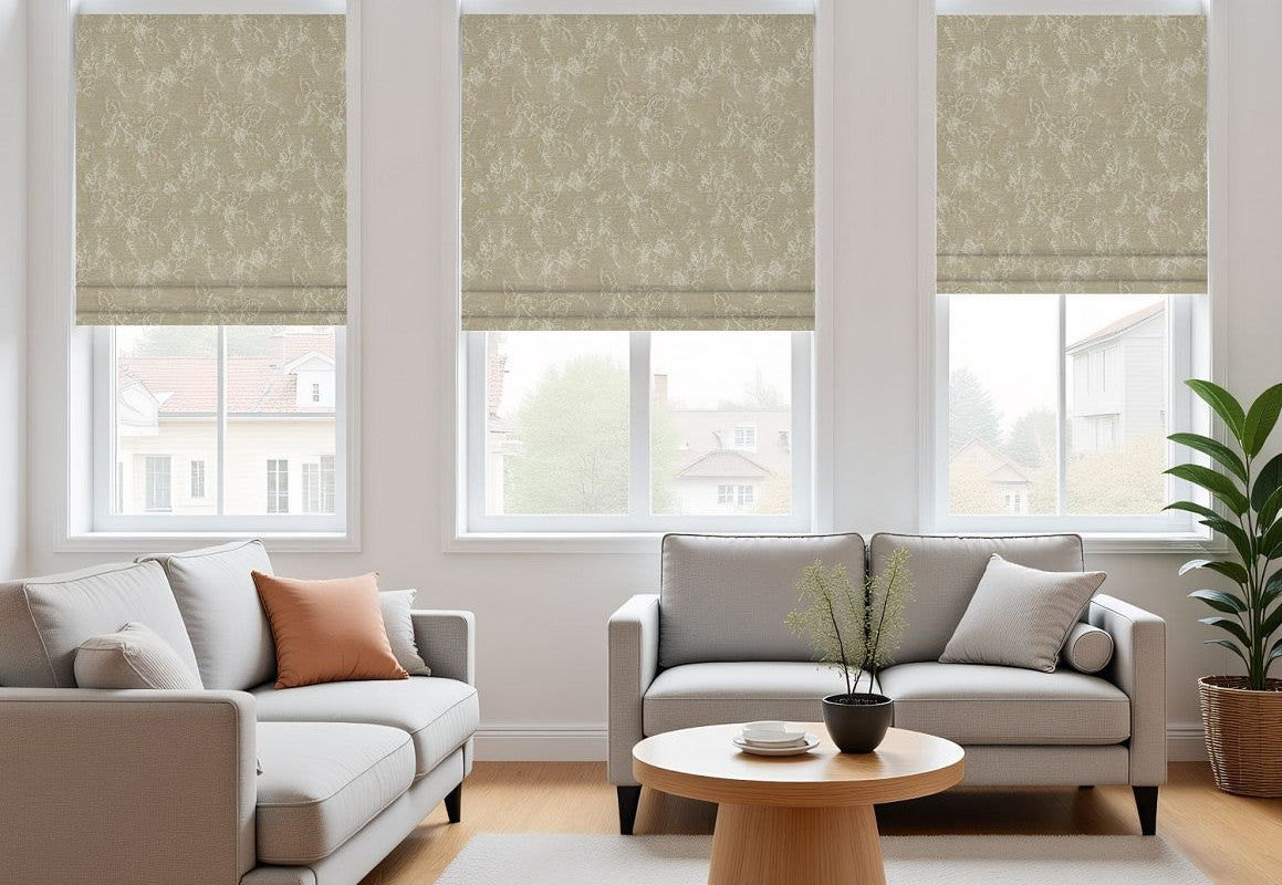 Add a touch of natural elegance to your home with our linen-cotton floral jacquard textured blackout Roman shades. Crafted from a premium polyester, these shades feature a delicate floral jacquard pattern that brings timeless charm and refined texture to any space. The blackout lining ensures excellent light control, privacy, and insulation, creating a comfortable environment throughout the day. Perfect for bedrooms, living rooms, or dining areas, the soft fabric folds provide a tailored finish while the floral motif adds warmth and sophistication. These Roman shades effortlessly balance functionality and style, making them an ideal choice for both classic and modern interiors.