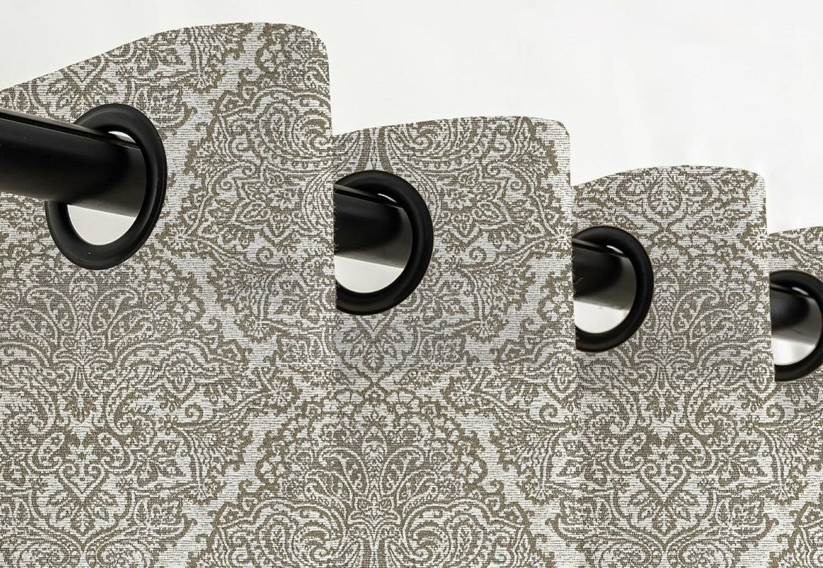 Enhance your home with the timeless elegance of Linen Baroque Jacquard Blackout Grommet Curtains. Expertly woven from a 15% linen and 85% polyester blend, these curtains combine the natural texture and softness of linen with the durability, wrinkle resistance, and easy-care properties of polyester. The intricate baroque jacquard pattern lends a luxurious and sophisticated aesthetic, perfect for both classic and modern interiors. Featuring a blackout lining, they block sunlight, reduce outside noise, and provide superior privacy while improving energy efficiency. The grommet header ensures smooth sliding and easy installation, making them ideal for bedrooms, living rooms, or dining areas.