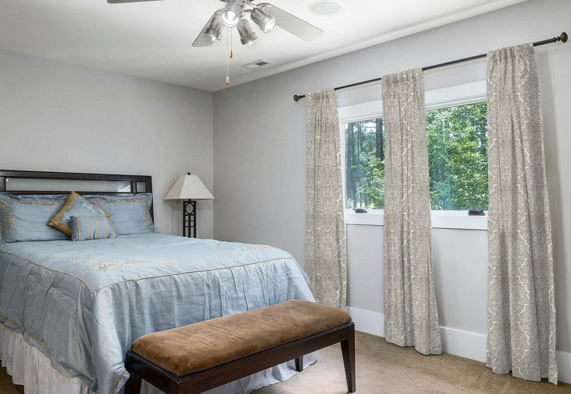 Curtain fullness refers to the relationship between the ordering width and the amount of fabric used in your curtains. The ordering width is the measurement of the area you want to cover, usually the width of your curtain rod (between the finials) or track. Fullness is a key aspect of curtain design, as it determines how the fabric will drape and gather when hung. Different heading styles require different fullness ratios, since some styles naturally use more fabric to achieve their intended look.