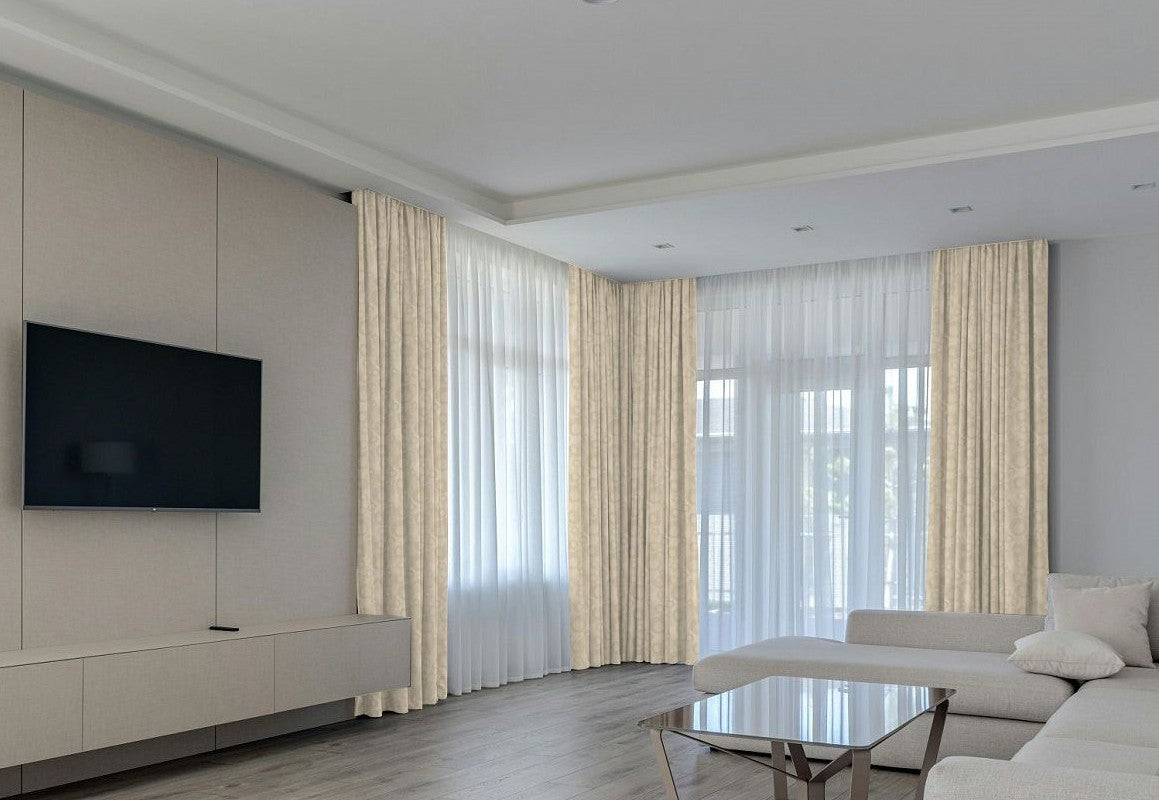 Curtain fullness refers to the relationship between the ordering width and the amount of fabric used in your curtains. The ordering width is the measurement of the area you want to cover, usually the width of your curtain rod (between the finials) or track. Fullness is a key aspect of curtain design, as it determines how the fabric will drape and gather when hung. Different heading styles require different fullness ratios, since some styles naturally use more fabric to achieve their intended look.