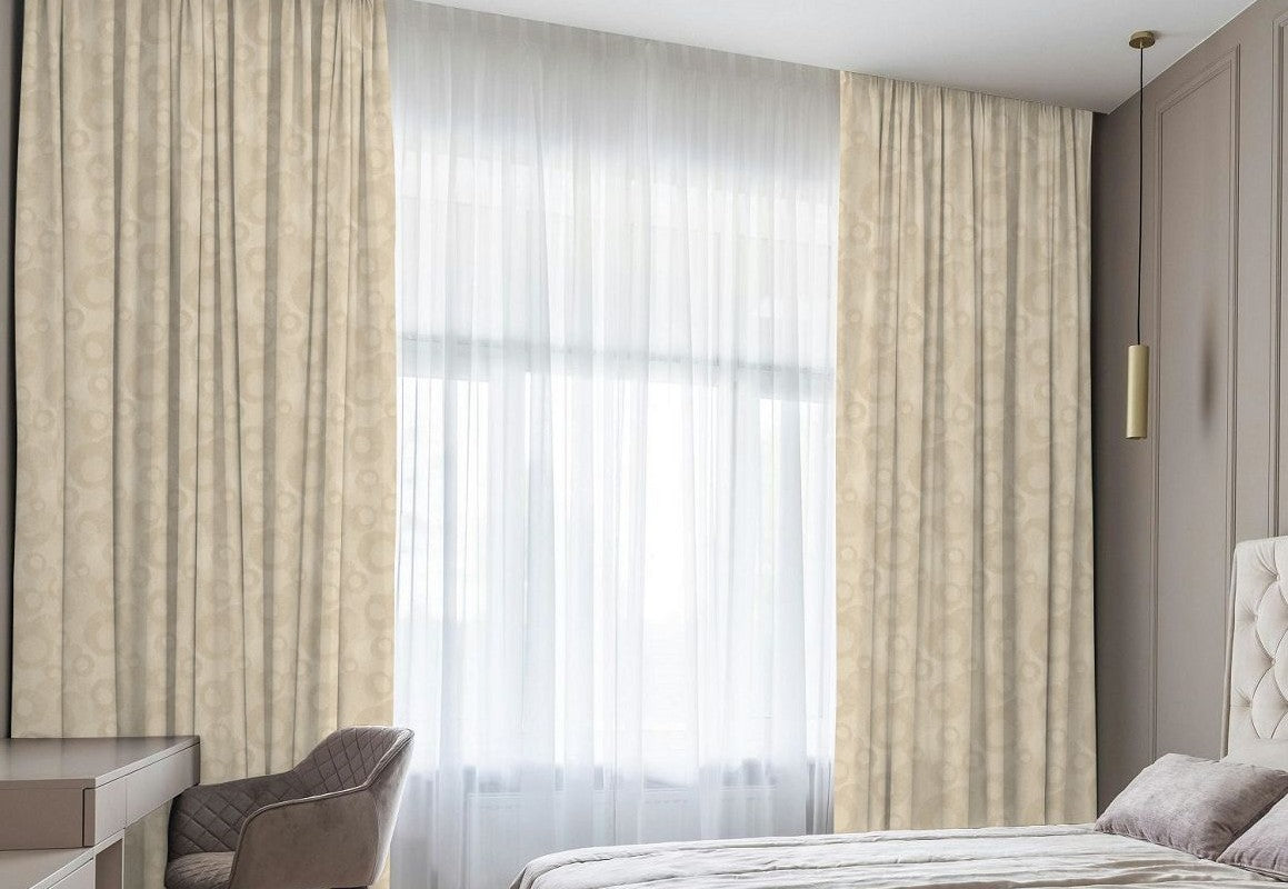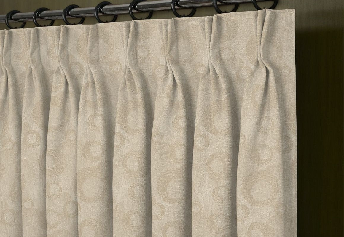 Add a touch of modern sophistication with Linen Abstract Circular Jacquard Blackout Pinch Triple Pleats Drapes. Made from a premium 15% linen and 85% polyester blend, these drapes combine the soft, textured elegance of linen with the durability, wrinkle resistance, and easy-care benefits of polyester. The abstract circular jacquard pattern brings a contemporary artistic flair, ideal for bedrooms, living rooms, or formal spaces. Designed with pinch triple pleats, they create deep, luxurious folds that enhance any interior. Featuring a blackout lining, these drapes offer superior light control, privacy, and energy efficiency, blending practical performance with stylish, modern luxury for polished, elegant interiors.