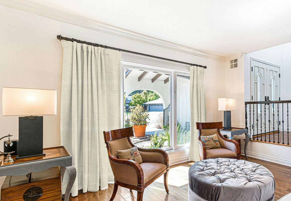 Curtain fullness refers to the relationship between the ordering width and the amount of fabric used in your curtains. The ordering width is the measurement of the area you want to cover, usually the width of your curtain rod (between the finials) or track. Fullness is a key aspect of curtain design, as it determines how the fabric will drape and gather when hung. Different heading styles require different fullness ratios, since some styles naturally use more fabric to achieve their intended look.